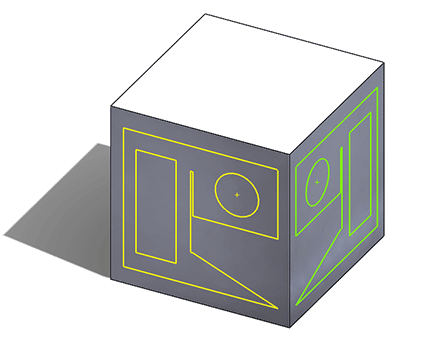 In meinem Beispiel habe ich die Ausgangsskizze (gelb) und die assoziative Skizze (grün) erstellt. Wird nun die gelbe Skizze geändert (Bemaßungen, Skizzenelemente, etc.), ändert sich auch die grüne Skizze vollständig mit. Das gilt natürlich auch wenn Sie die grüne mehrfach eingefügt haben.