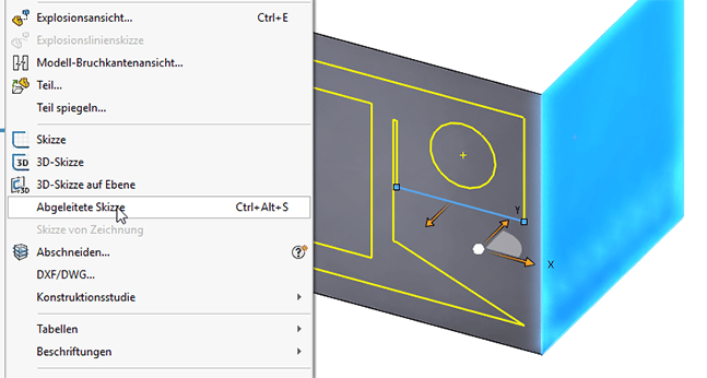 • Danach wählen Sie aus dem Menü Einfügen > Abgeleitete Skizze aus
