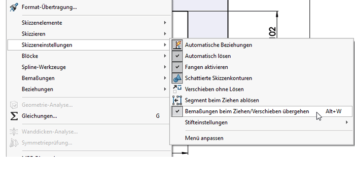 Aktivieren Sie allerdings in den Skizzeneinstellungen die Option „Bemaßung beim Ziehen/Verschieben übergehen“, können Sie komfortabel die Geometrie ziehen und die Bemaßungswerte ändern sich automatisch mit.