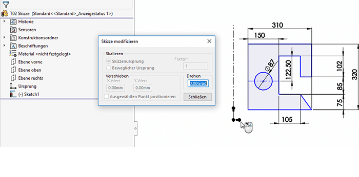 Die Funktion „Skizze modifizieren“ kann aber noch mehr: Sie können damit Skizzen drehen oder diese inklusive Bemaßungen skalieren.