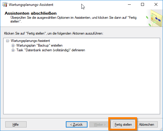 Überprüfen Sie abschließend die Einstellungen und klicken Sie auf „Fertig stellen“, um den Wartungsplan-Assistenten abzuschließen.