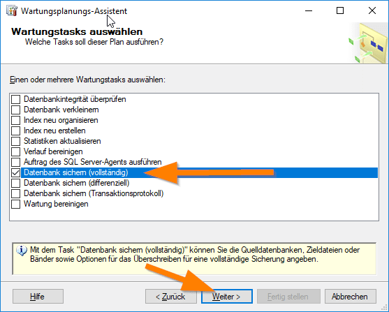 Wählen Sie die Option Datenbank sichern (vollständig) und klicken Sie auf „Weiter“.