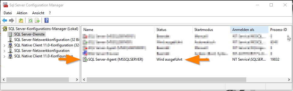 Stellen Sie sicher, dass der SQL Server-Agent- Dienst ausgeführt wird. Starten Sie den SQL Server-Konfigurations-Manager- Programm, und überprüfen Sie, ob der SQL Server-Agent derzeit ausgeführt wird. Wenn dies nicht der Fall ist, klicken Sie mit der rechten Maustaste auf den Agenten, und klicken Sie auf „Start“.