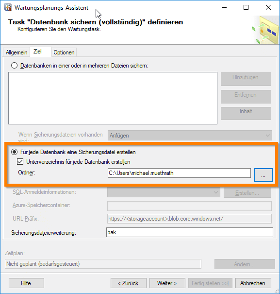 Klicken Sie auf den Reiter „Ziel“, um den Speicherort des Ordners für die Datenbankdatei anzugeben. Beim Schreiben auf ein Netzlaufwerk muss auf ausreichende Berechtigung geachtet werden.