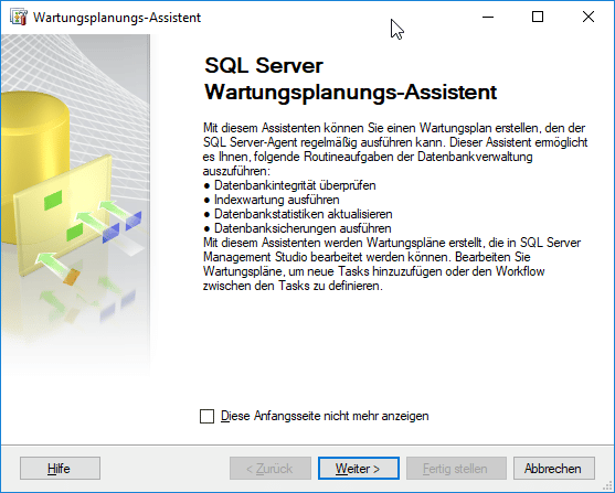 Beim Start des Assistenten wird auf der Startseite näher erläutert, welche Funktionen mit dem Wartungsplan automatisiert werden können. Wir werden uns hier auf die Durchführung von Datenbanksicherungen konzentrieren. Klicken Sie auf „Weiter“, um die Sicherungen einzurichten.