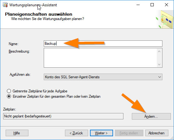 Benennen Sie den Wartungsplan und klicken Sie auf „Ändern“, um einen Zeitplan für die Ausführung des Plans zu erstellen.