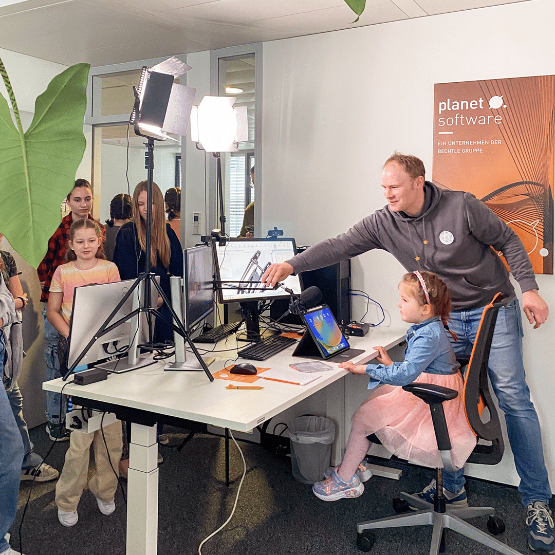 Wie vielseitig die Arbeit in technischen Berufen sein kann, erlebten die Mädchen bei planetsoftware. Ein abwechslungsreiches Programm rund um die Möglichkeiten in der Produktentwicklung erwartete die Mädchen. Dominik Kirschner führte die Mädchen durch seinen Arbeitsalltag bei planetsoftware und beantwortet dabei spannende Fragen: