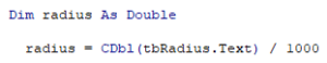 Um nun die Eingabe zu definieren, fügen wir eine Variable mit dem Namen „Radius“ ein, welche mit dem Text aus der Textbox (tbRadius.Text) befüllt wird. Im Makro wird die Einheit Meter verwendet, um auf Millimeter umzurechnen wird die Variable durch 1000 geteilt.