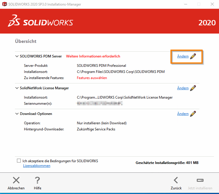 Klicken Sie auf der Übersichtsseite auf „Ändern“, um die PDM-Installation zu konfigurieren.