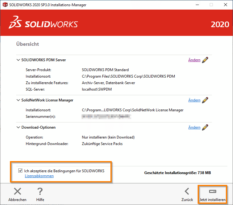 Akzeptieren Sie die Lizenzvereinbarung und klicken Sie auf „Jetzt installieren“, um die Installation von SOLIDWORKS PDM Standard Server abzuschließen.