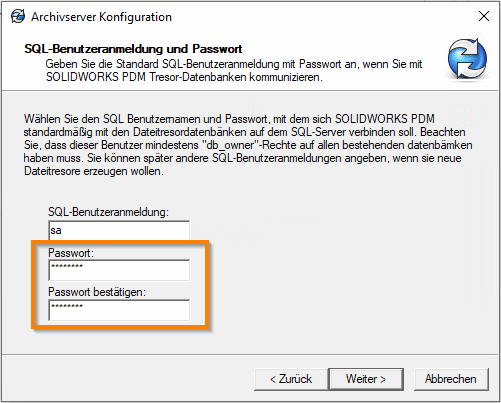 - Geben Sie das „sa-Kennwort“ ein, mit dem auf die SQL-Datenbank zugegriffen werden soll. Zusammen mit SOLIDWORKS PDM Standard wird Microsoft SQL Express installiert. Wenn Sie Microsoft SQL Express bereits installiert haben, können Sie die vorhandene Instanz verwenden.