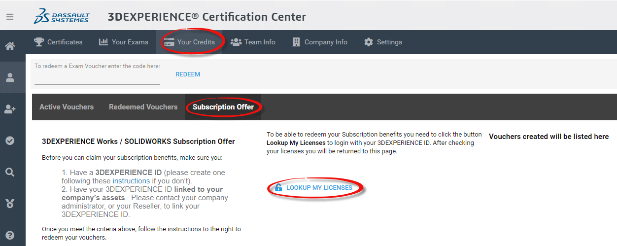 2. Klicken Sie im Zertifizierungscenter auf die Registerkarte „Your Credits“ ›› Registerkarte „Subscription Offer“ ›› „Lookup My Licenses“Ansicht Gutscheine - Kostenlose SOLIDWORKS Zertifizierungsgutscheine