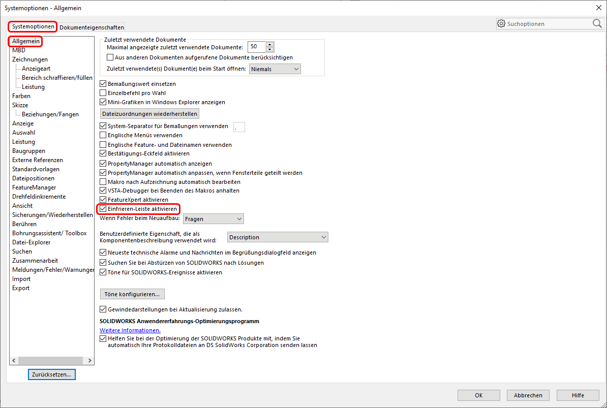 Mein Tipp: Wer die „Einfrieren-Leiste“ noch nicht kennt, sollte diese unbedingt bei komplexen Bauteilen ausprobieren – sie ermöglicht das Einfrieren des Feature-Baums an beliebiger Stelle und somit eine deutliche Reduktion der Wiederaufbauzeit, unter anderem auch beim Speichern oder Öffnen in Baugruppen.