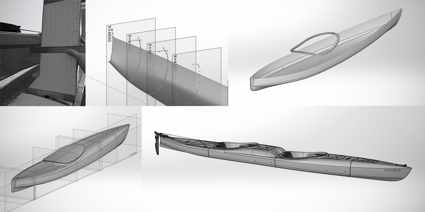 Nach den ersten Gesprächen zur Definition der Anforderungen begann die Analyse verschiedener Rumpftypen in Bezug auf Geschwindigkeit, Geradeauslauf, Wendigkeit oder Stabilität. Von passenden Modellen wurden dann Querschnittsprofile abgenommen, mittels Punktewolke in SOLIDWORKS Skizzen eingefügt, Leitkurven erstellt und anschließend aus diesen mit Oberflächen-Features erste Rumpfentwürfe (Unterschiff) modelliert – Kielsprung, Skeg (Heckflosse), U- oder V-Spant waren nur einige Eigenschaften, die exakt definiert werden mussten. Die Oberflächenmodelle wurden mehrfach in ihren Abmessungen skaliert und schlussendlich mit einer individuellen Heckpartie versehen. Das Konzept für die Teilungen musste sehr früh festgelegt werden, da dies absolute Schlüsselstellen eines modularen Kajaks sind. Parallel dazu entstanden die ersten Designstudien des Decks (Oberschiff).