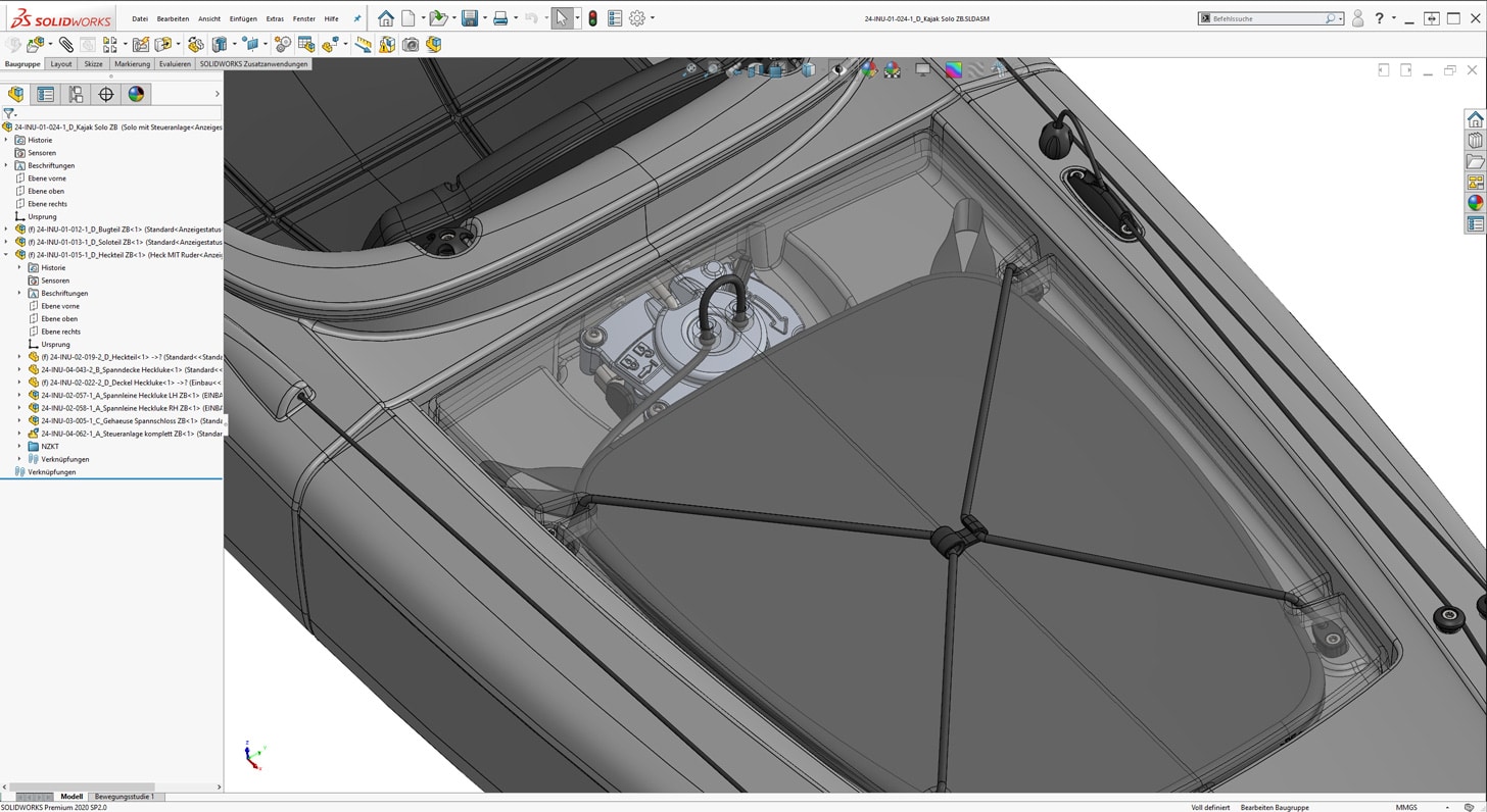 In weiteren Entwicklungsschleifen galt es nun, alle notwendigen Anbauteile inklusive den Verbindungsmechanismen im und am Kajak anzupassen, sowie die finalen werkzeugfähigen CAD-Daten zu generieren. Verifiziert wurde die Konstruktion anhand einiger Teile aus dem 3D-Drucker sowie einem Testteil für die Verbindung der Module. Nach kleinen Korrekturen und ausgiebigen Tests der ersten Prototypen gab es dann die Freigabe für die Produktion.