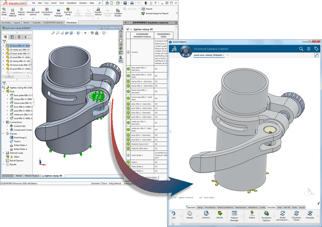 Sie können direkt von SOLIDWORKS Simulation aus auf SPE zugreifen und Ihre Geometrie und Simulationseinstellungen mit einem einzigen Klick zu SPE übertragen. Konfigurieren Sie erweiterte Simulationen durch Wiederverwendung von Lasten, Randbedingungen, Netzdefinitionen und Materialeigenschaften jetzt noch schneller. Jedes Mal, wenn Sie Ihre SOLIDWORKS CAD-Konstruktion ändern, wird Ihr Simulationsmodell in SPE automatisch aktualisiert.