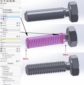 In dem Gewinde Feature wird für die Gewindeposition die äußere Kante plus ein Offset gewählt, damit das Gewinde sauber einlaufen kann.