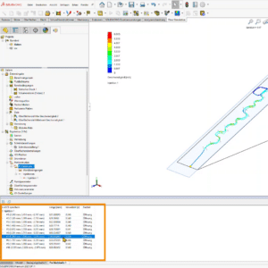 Im nächsten Schritt legen wir die Randbedingungen für den Einlass fest und wählen einen Volumenstrom von 2 Liter pro Minute. Den gleichen Vorgang wiederholen wir für den Auslass und aktivieren die Drucköffnung mit statischem Druck und wählen die Fläche im Ziel unserer Piste an. Zur Auswertung unserer Simulation wählen wir als Zieldefinition der Oberflächenziele den Mittelwert und das Maximum der Geschwindigkeit. Nach Eingabe aller Parameter kann die Berechnung ausgeführt werden. In der Vorschau ist die durchgeführte Strömungsanalyse bereits ersichtlich.