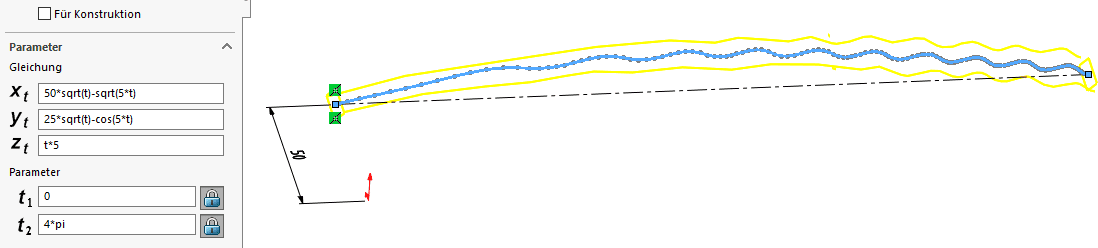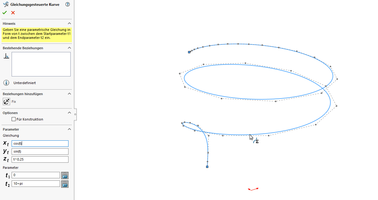 Hier ist es besser die Parametrik in SOLIDWORKS mittels „Gleichungsgesteuerter Kurve“ zu nutzen. In diesem Beispiel erstelle ich einen 3D Spline mittels einer Gleichung und setze in diese entsprechende Parameter ein: