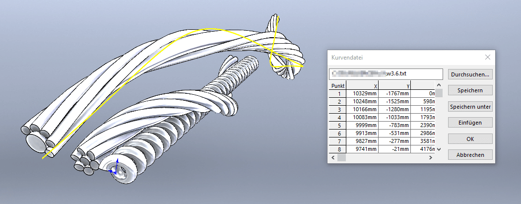 TIPP: Wenn Sie den 3D-Verlauf von einer externen Quelle (Berechnungsprogramm, Messmaschine, Scanner, etc.) zugeliefert bekommen, können Sie, wie in meinem Beispiel, die 3D-Skizzen mittels Kurvendatei erstellen: