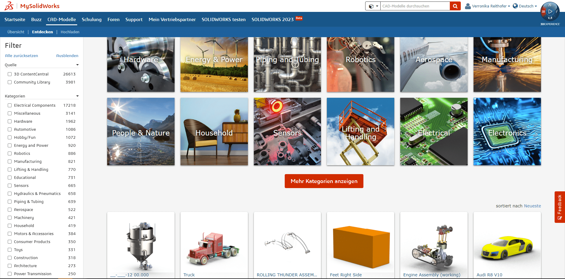 Die Filterfunktion ermöglicht Ihnen die Suche in den verschiedensten Kategorien, wie z. B. Electrical, Manufacturing, Robotics, Piping & Tubing, Industrial Equipment, Military uvm.